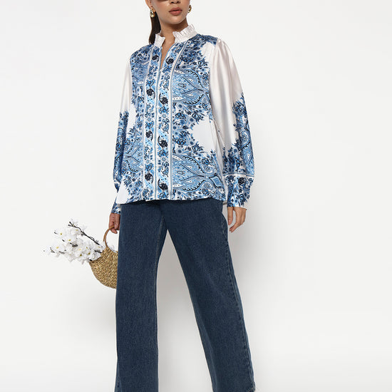 Willow Satin Shirt, a versatile piece designed to make every look stand out. Crafted from smooth satin, it features a stunning blue paisley and floral print on a soft ivory base, inspired by classic porcelain artistry.