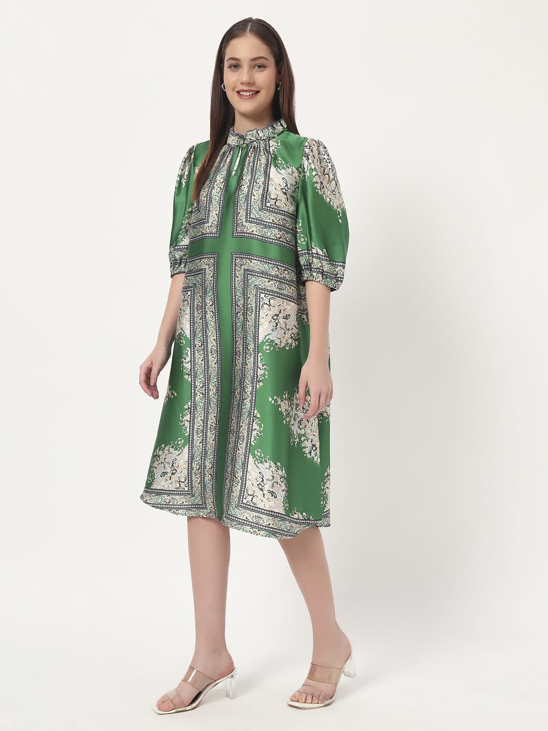 Step into effortless style with our Emerald Elegance Printed Satin Dress. Designed for the modern woman who values both comfort and class, this dress features a rich emerald green base adorned with intricate baroque-style prints for a luxurious look.
