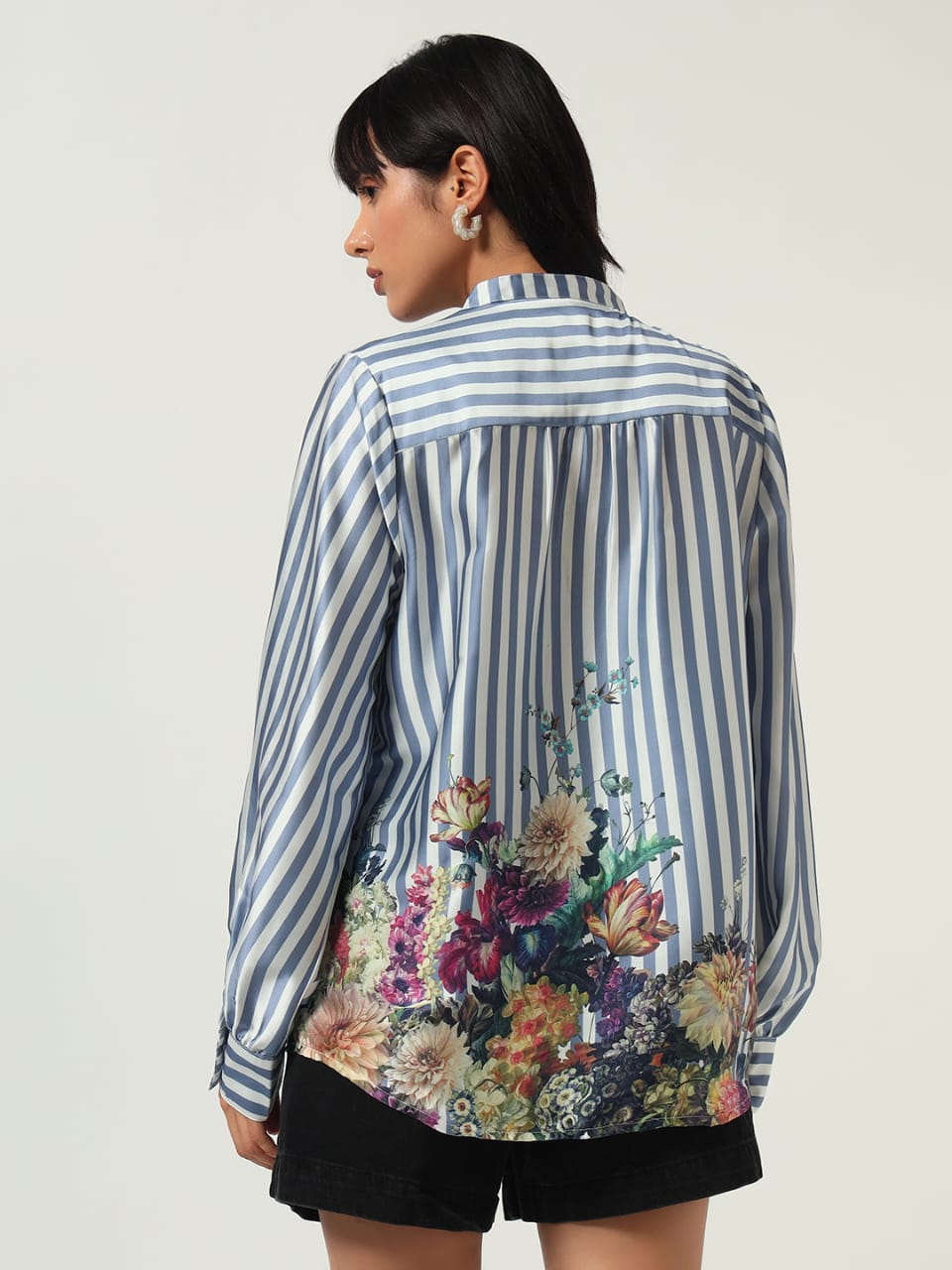 Turn heads with this stylish blue and white striped satin shirt, beautifully finished with a vibrant floral print at the hem. Crafted for the fashion-forward woman, it blends timeless stripes with bold blooms for a truly unique look.